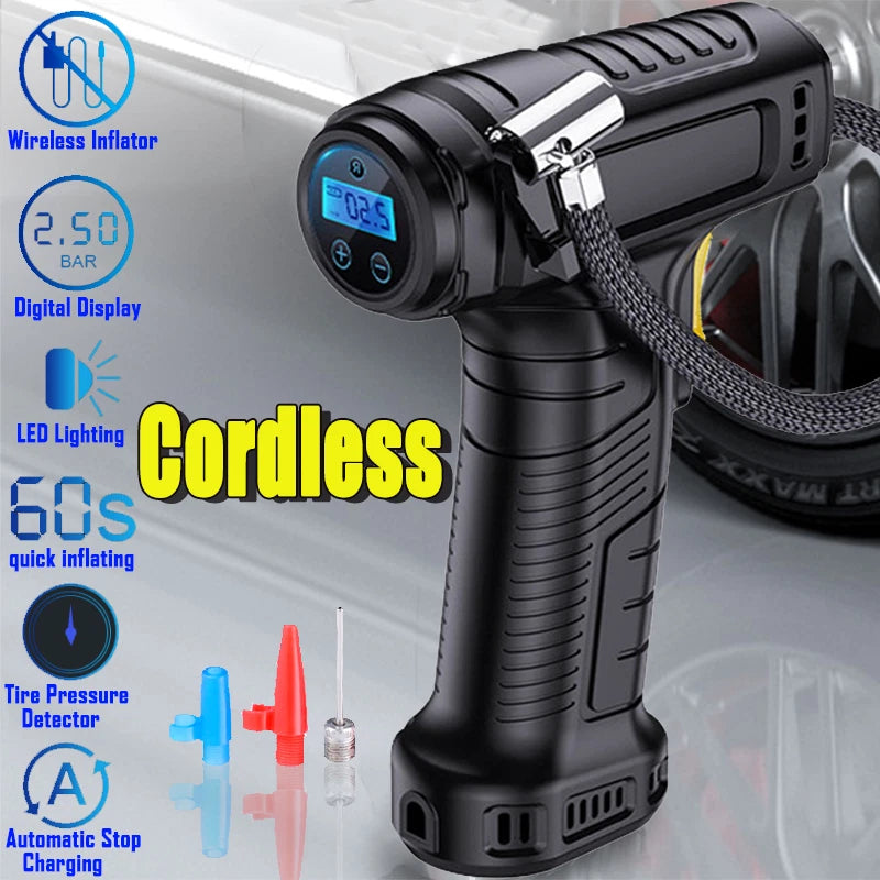 - Cordless Tire Inflator Portable Air Compressor, Battery Rechargeable Bike Air Pump with Digital Pressure Gauge,150PSI Auto Off Electric Wireless Pump for Car Bike Ball Motorcyle