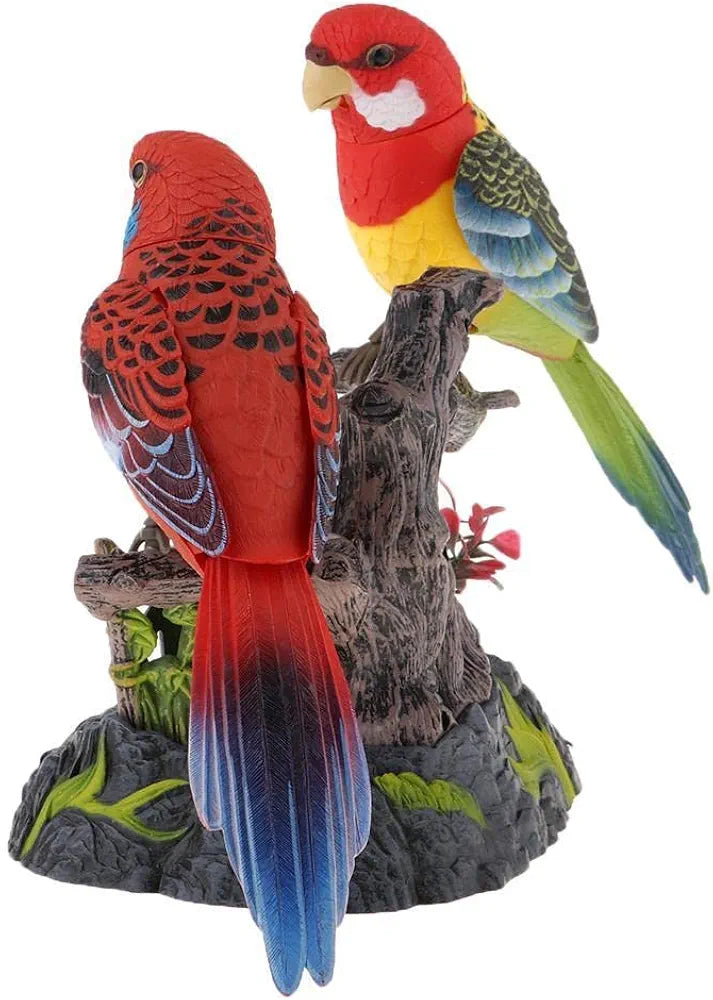 Simulation & Voice-activated Induction Design】This simulated parrot is designed vividly just like the real one. It has a sound sensing microchips. Once it hears a noise, it starts chirping and fluttering its wings and moving head and tail(Lasts about 1 minute), like a real bird.High simulation degree】Lifelike birds, high simulation branches, fine workmanship, just like real birds. Made of resin and circuit board, high uantity